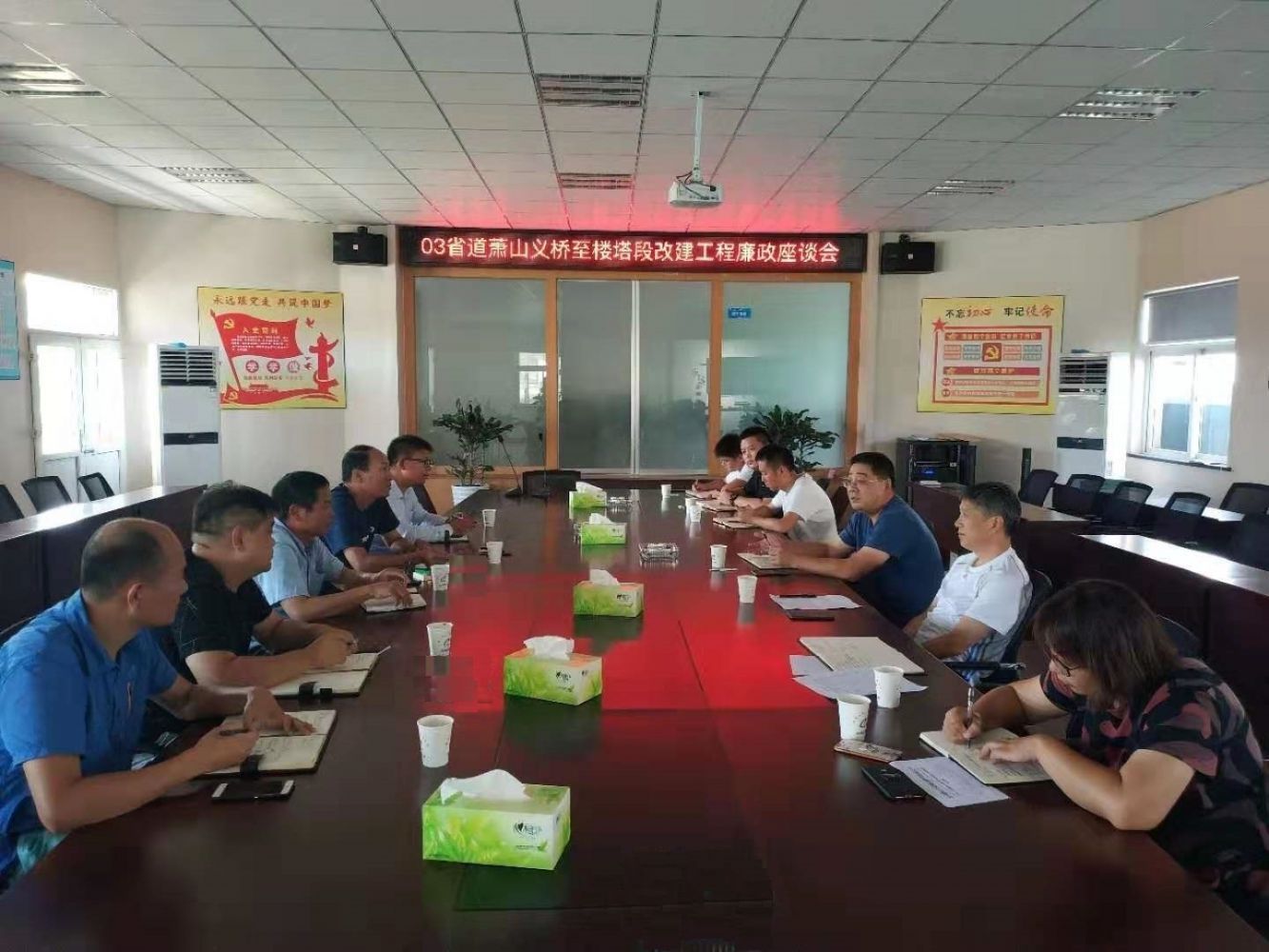 2019年8月2日下午兩點(diǎn)半,在03省道蕭山義橋至樓塔改建工程四標(biāo)項(xiàng)目部召開(kāi)了03省道蕭山義橋至樓塔改建工程廉政座談會(huì)。會(huì)議由紀(jì)檢組組長(zhǎng)龔鐵峰主持,公司紀(jì)檢小組成員、公司項(xiàng)目管理人員、監(jiān)理辦、項(xiàng)目部負(fù)責(zé)人及管理人員代表參加。