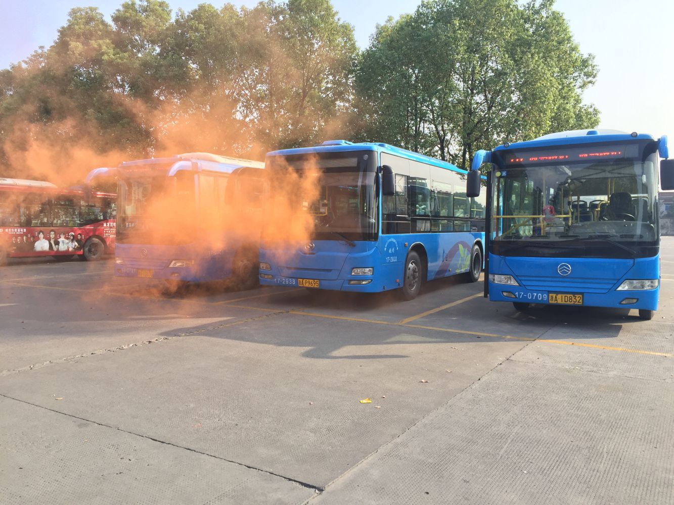 上午9時(shí),演練正式開始,一枚煙幕彈在公交車底部燃燒,該公交車開始冒煙,9時(shí)25秒,一名保安在巡查時(shí)發(fā)現(xiàn)突發(fā)情況,立即使用4KG手提式干粉滅火器進(jìn)行撲救,隨后進(jìn)行上報(bào)并報(bào)警,9時(shí)30秒時(shí),場站監(jiān)控室發(fā)現(xiàn) “火情”,拉響警報(bào),9時(shí)1分10秒通惠路站一車隊(duì)、二車隊(duì)、五車隊(duì)及物業(yè)消防應(yīng)急隊(duì)伍趕到現(xiàn)場,用4KG手提式干粉滅火器進(jìn)行撲救,場站司機(jī)迅速疏散 “起火”公交車周邊車輛,9時(shí)1分45秒第一輛車被安全疏散,9時(shí)2分25秒義務(wù)消防隊(duì)員啟用消防栓,9時(shí)2分35秒消防水帶出水,9時(shí)3分45秒火勢撲滅,警報(bào)解除。