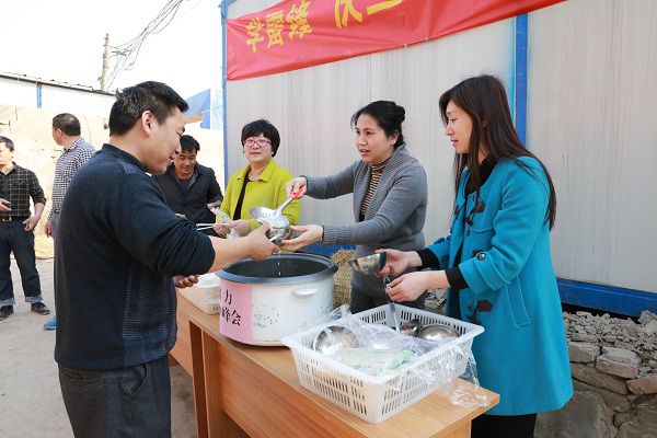 一直忙到下午一點半,所有的餃子和饅頭終于被分類打包完畢。在湘運(yùn)公司副經(jīng)理韓利明的幫助下,婦委工作人員們帶著滿滿一箱心意驅(qū)車前往湘湖三期湖面挖運(yùn)項目工地。湘湖三期湖面挖運(yùn)項目作為G20峰會保障重點項目之一,由長運(yùn)公司下屬湘運(yùn)公司承建,預(yù)計到3月底前完工,此時工地上正是一片熱火朝天的忙碌景象。當(dāng)日天氣晴好,項目現(xiàn)場塵沙飛揚(yáng),被用作辦公室的臨時板房里異常悶熱。婦委的工作人員們一邊招呼工友們吃餃子、饅頭,一邊連連感慨:“工地上的條件實在太艱苦了!你們辛苦了!多吃點!”