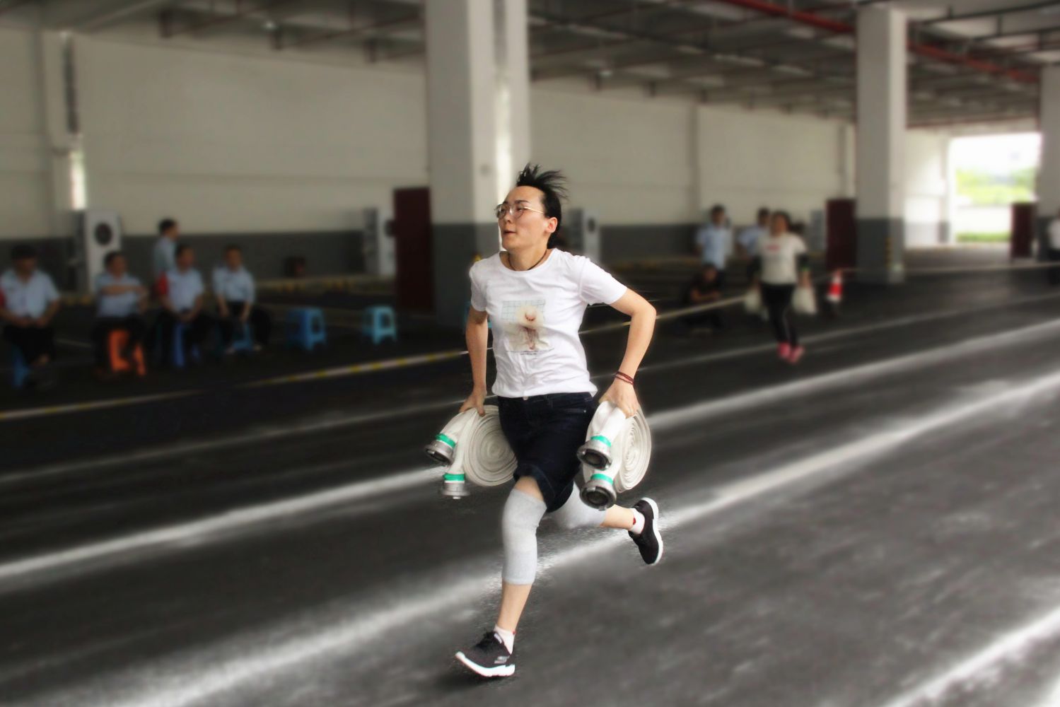 本次比武設置了消防理論知識考試、50米4公斤干粉滅火器滅火、雙手提消防水帶4×50M接力賽、消防水帶二人三帶操作等4個項目,共有10支隊伍參與角逐。隨著裁判喊出“開始!”的口令,各參賽隊迅速進入狀態,選手們拋接水帶快速有力、滅火噴灑精準到位,將平日的訓練水平表現得淋漓盡致,贏得觀眾的陣陣喝彩,現場氛圍甚濃。