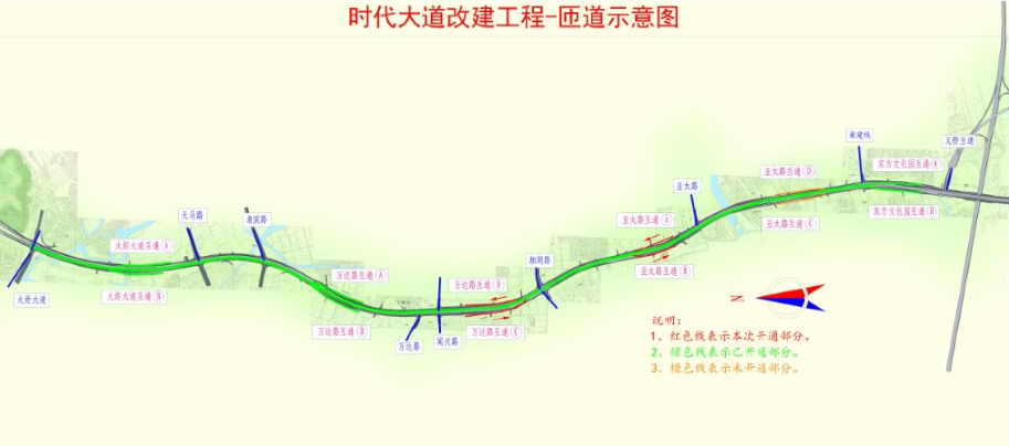 2022年4月2日(周六)10時起,時代高架萬達路、亞太路上下匝道,以及時代大道(區(qū)界-亞太路)地面道路將開通試運行。