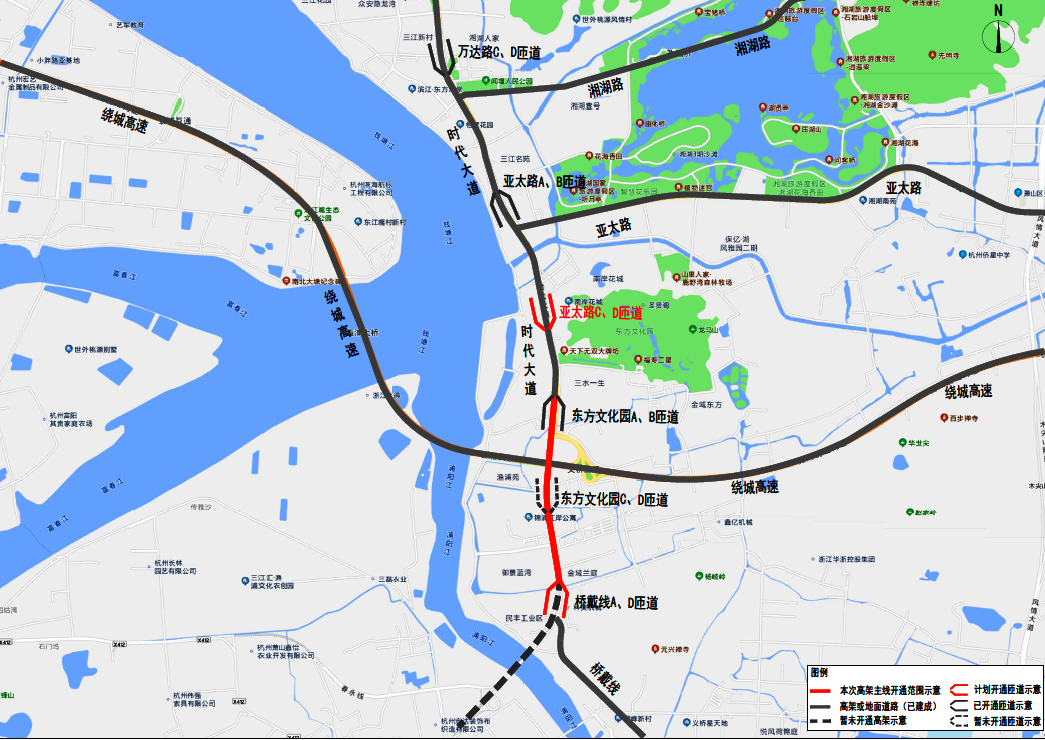 時(shí)代大道改建工程通車段為亞太路C、D匝道及主線高架剩余0.82千米路段,其中:由南往北(義橋往杭州方向)可通過(guò)亞太路D匝道從主線高架下橋,進(jìn)入地面向北通行;由北往南(杭州向義橋方向)可通過(guò)亞太路C匝道進(jìn)入主線高架向南通行,全程約0.8公里。