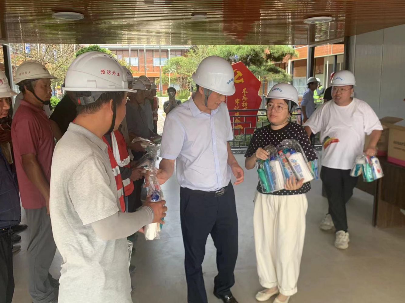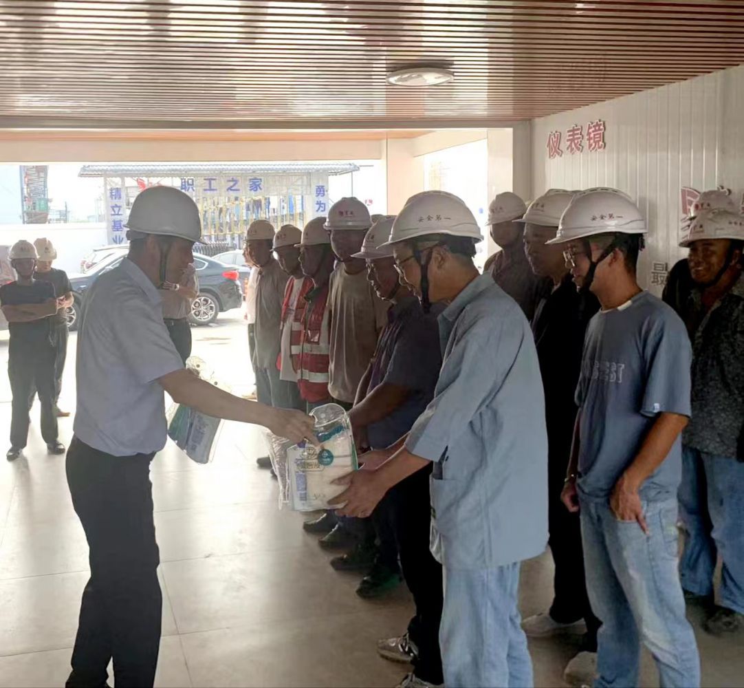公司黨支部書記邵發強、副總經理金莎帶隊前往黨灣安置房項目施工現場,走訪慰問一線施工人員,向堅守崗位的施工人員送上高溫慰問品,感謝他們的堅守和付出,為工程項目安全有序推進提供了堅強保障。同時,叮囑施工單位要切實關心一線施工人員,合理安排工人的工作和休息時間,切實保障工程質量、施工進度和生產安全。