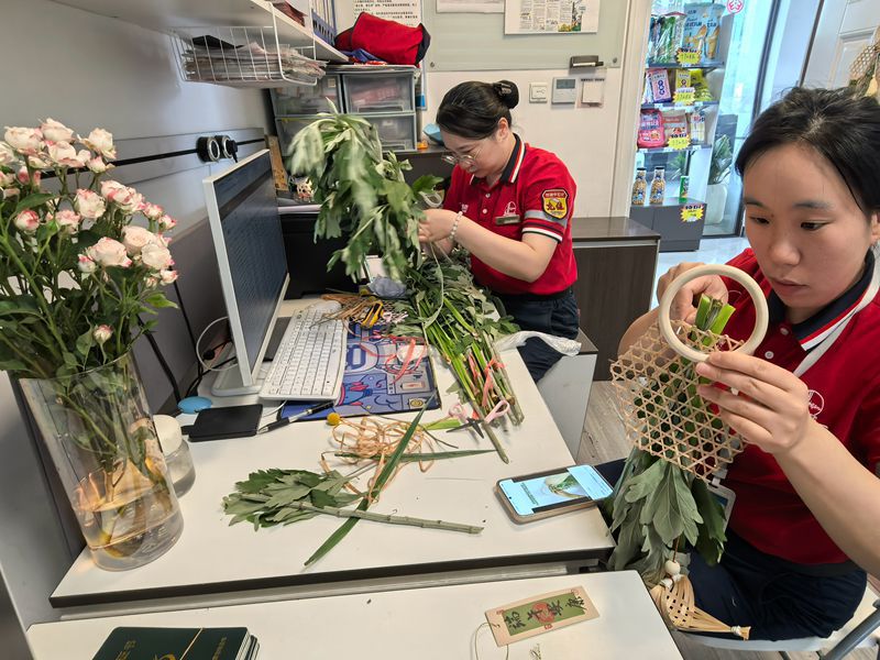 公司組織員工親手制作了各類艾草手工藝品,編竹網(wǎng)、綁艾草,成了端午節(jié)最應(yīng)景的裝飾。員工將親手制作的手工品贈送給到站顧客,向他們表示感謝,謝謝他們的光顧和對站點的支持,并為他們送上端午祝福。