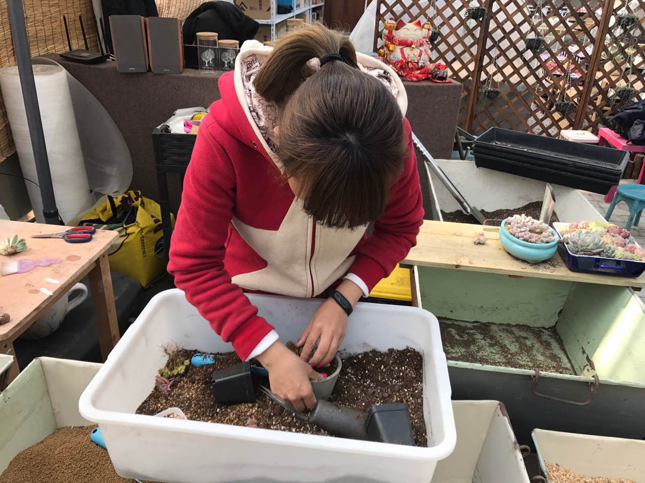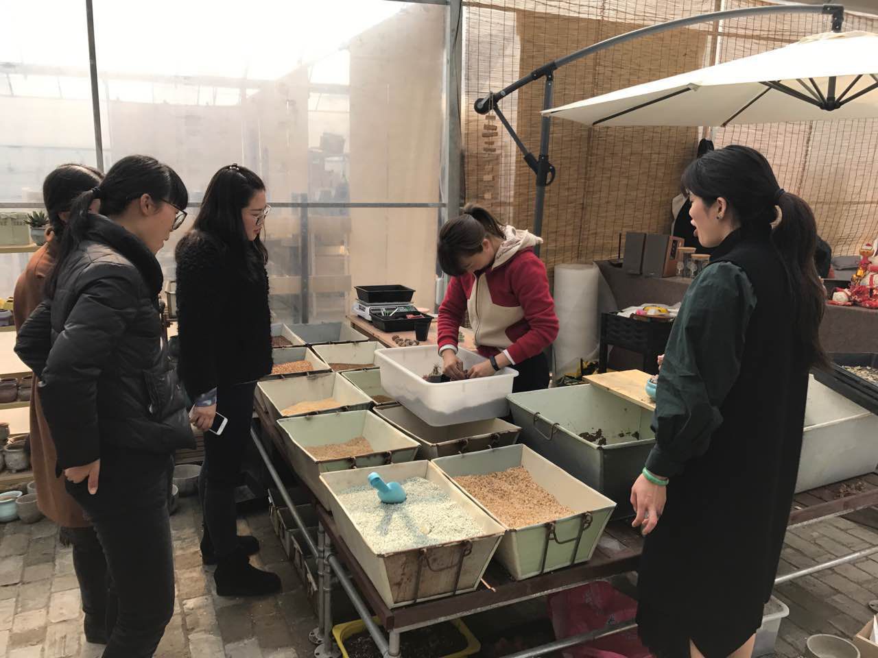 多肉植物園老師現場為女職工拼裝多肉植物。