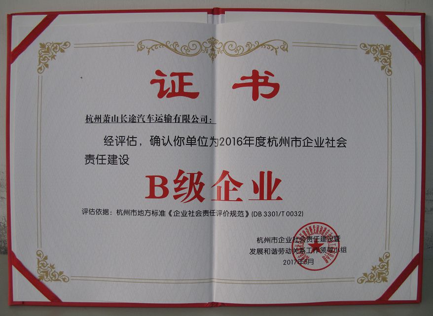 蕭山長運公司榮獲2016年度杭州市企業社會責任建設B級企業