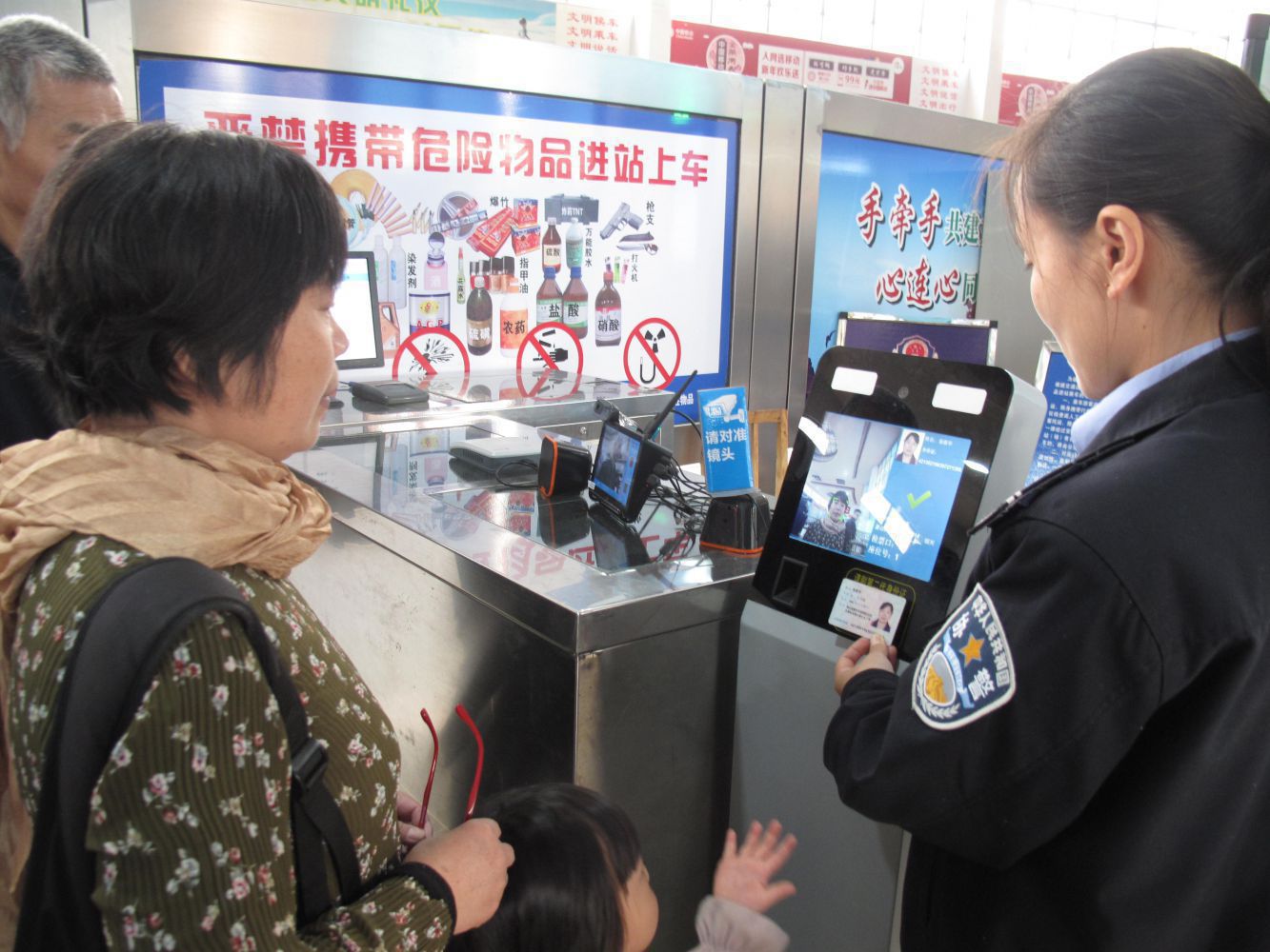 十月中旬開始,蕭山汽車總站入口安檢處全面啟用人證票合一核驗、人臉識別系統,確保“人證票合一”。通過人證合一認證終端,將現場人臉照和證件照快速進行身份驗證比對,同時核驗是否有購票記錄,只有三者驗證一致后旅客方能進入候車區域。