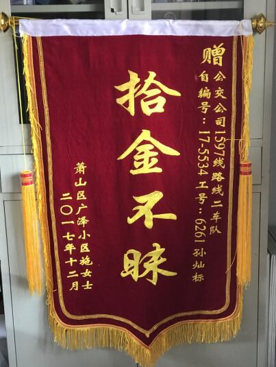 12月10日,市民施女士來到蕭山公交二車隊送錦旗。錦旗上寫著四個閃閃發光的大字:“拾金不昧”,感謝公交公司1597線路的孫燦標師傅拾金不昧的精神。