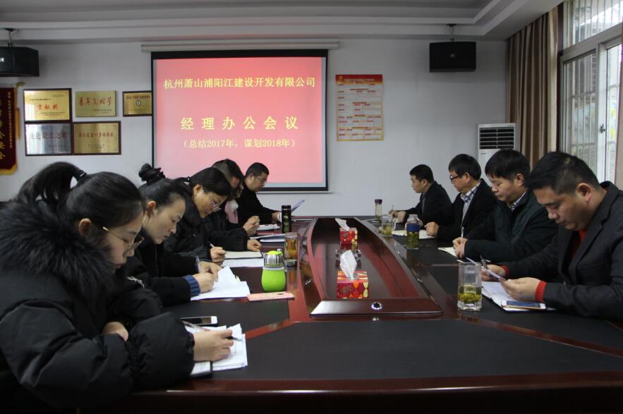 2018年1月2日,元旦假期結(jié)束的第一天,浦陽江開發(fā)公司召開經(jīng)理辦公會(huì)議,專題總結(jié)2017年全年的工作成績(jī)和經(jīng)驗(yàn),分析當(dāng)前公司面臨的形勢(shì),查找工作中存在的不足,明確公司在2018年的工作任務(wù)和發(fā)展目標(biāo),公司班子成員、部門負(fù)責(zé)人、工青婦負(fù)責(zé)人參加了本次會(huì)議。會(huì)上,公司部門和工青婦負(fù)責(zé)人分別匯報(bào)了2017年的成績(jī)及2018年的工作思路,反思了工作存在的問題,班子領(lǐng)導(dǎo)對(duì)工作方向進(jìn)行布置和安排。最后,韓總對(duì)2018年公司各項(xiàng)目標(biāo)任務(wù)進(jìn)行明確,并提出了全局觀念、責(zé)任擔(dān)當(dāng)、工作有計(jì)劃、團(tuán)結(jié)協(xié)作、做最好的自己、廉潔自律六方面的要求。