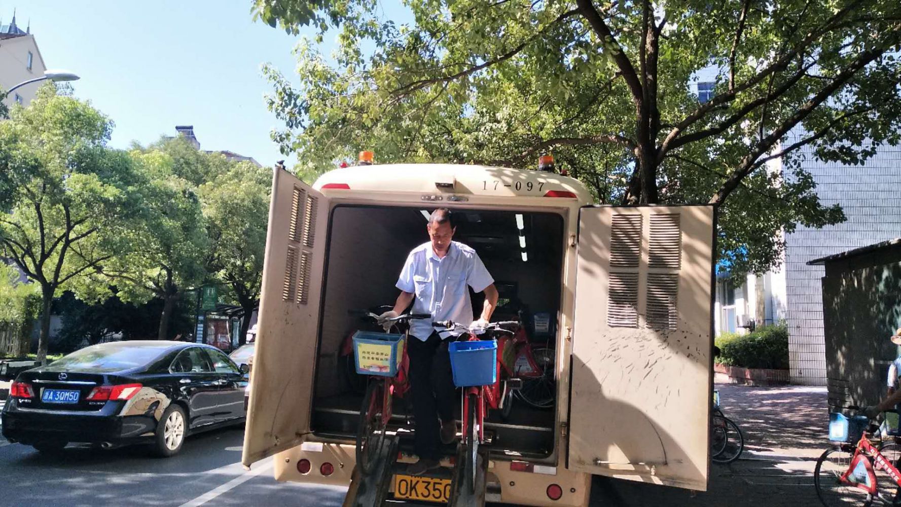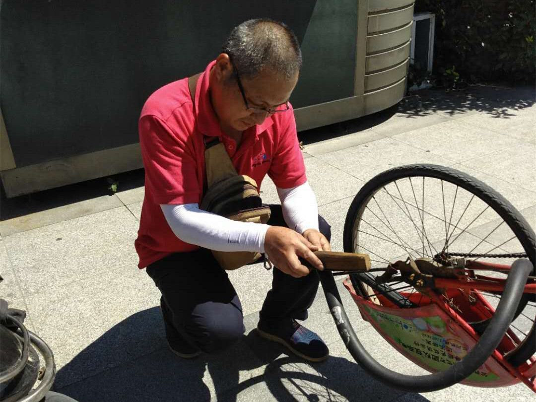 公共自行車(chē)值守人員李國(guó)平,每天在體育館南服務(wù)點(diǎn)頂著烈日高溫,檢查、擺放站點(diǎn)車(chē)輛。僅在早晚高峰時(shí)段,上樁下樁車(chē)輛就達(dá)兩百多車(chē)次。衣服被汗水浸濕了又干,干了又濕。調(diào)度車(chē)駕駛員陳炳田和搬運(yùn)工來(lái)可奇、王國(guó)榮,每天運(yùn)送公共自行車(chē)兩百多輛。自行車(chē)站點(diǎn)上熱浪襲人,剛剛裝、卸幾輛自行車(chē)的他就已大汗淋漓,臉上掛滿(mǎn)汗珠。汗水流進(jìn)了眼睛,汗水沁透了衣衫。才稍微干了點(diǎn)兒的衣服立即又濕了一大片。自行車(chē)維修工董浩成,每天拿到任務(wù)單后,便開(kāi)始了一天的檢修工作,為自行車(chē)挨個(gè)“體檢”,每天工作近10小時(shí),從早上上班開(kāi)始,雙手就因?yàn)樾捃?chē)沾滿(mǎn)了油污和泥土,他們嫻熟的動(dòng)作、十足的干勁、揮灑的汗水……不由地令人心生敬意。