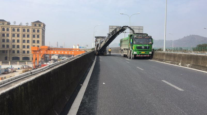 在開工儀式后,03省道東復線高架南延工程第3合同段馬上進入橋梁拆除作業的瀝青路面銑刨工作。