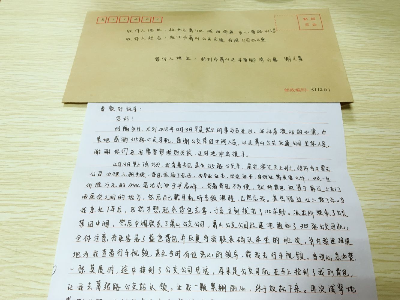12月19日,蕭山公交班子領(lǐng)導(dǎo)收到一封來自市民的感謝信,字里行間深切表達(dá)了其對(duì)315路公交司機(jī)、公交公司以及公交集團(tuán)中調(diào)人員的感謝。經(jīng)了解,信中提到的公交司機(jī)為四車隊(duì)張冠軍。原來,12月13日中午,謝女士再乘車前往濱江的過程中,由于正逢早高峰,在下車時(shí)不慎將背包遺落在座位上。后經(jīng)過派出所、集團(tuán)中調(diào)與蕭山公交的多方聯(lián)系,順利前往站房尋找失物。而另一邊張師傅在到站巡查時(shí),也發(fā)現(xiàn)了車內(nèi)的背包,于是立即前往站房上交車隊(duì),此時(shí)謝女士在蕭山公交管理人員的陪同下已經(jīng)在站房等候了,經(jīng)仔細(xì)核對(duì)后,張師傅將失物歸還原主。