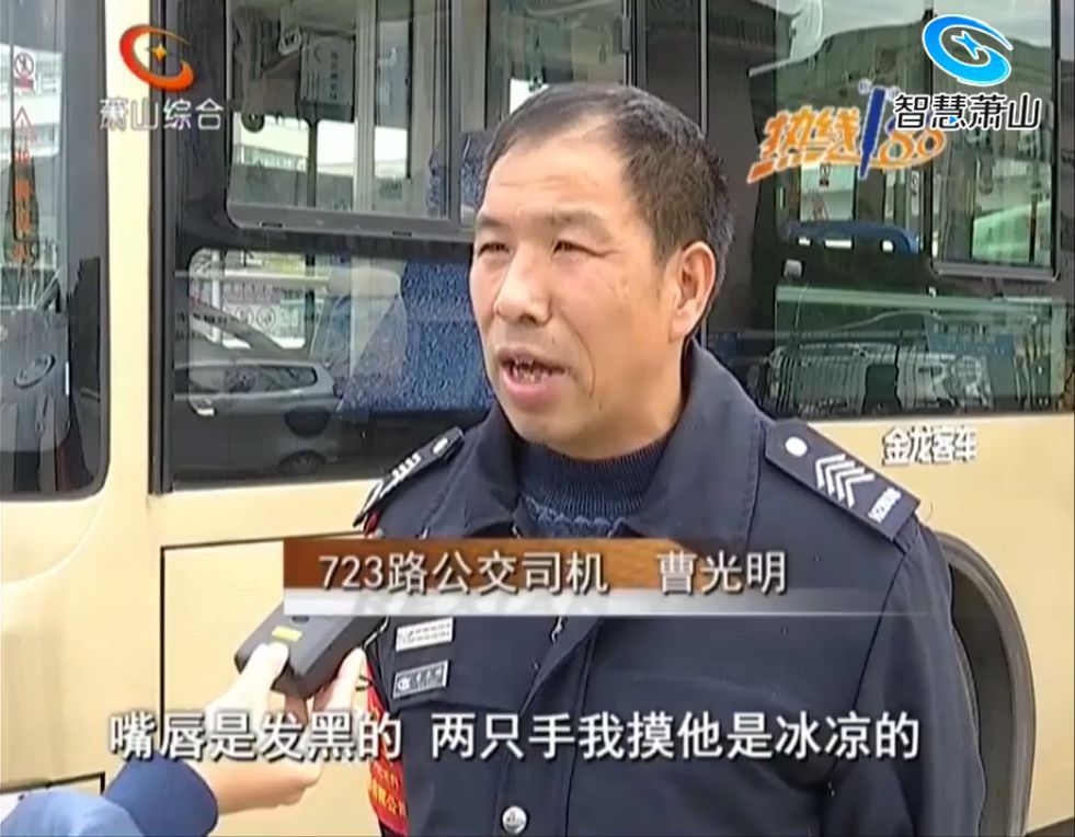 事情發生在12月19日,上午9:25分左右,蕭山公交一車隊司機曹光明駕駛723路從江橋北公交站開往廣仁小區,途徑潘水站時,從后視鏡內觀察到車上一位老人臉色蒼白,頭部靠著車窗,情況異常,曹師傅立刻將車輛安全停靠,上前查看情況。