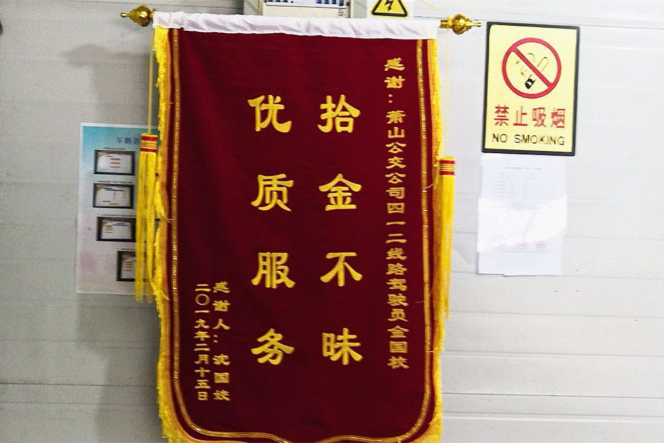 “流浪”的太陽悄悄回歸,被雨水浸泡多日的杭城終于迎來了小小的晴天,而近日,蕭山公交也出現了如陽光般溫暖的一幕——2月26日,二車隊城北站房收到一面錦旗,上面“拾金不昧 優質服務”的八個金色大字格外醒目,原來這是市民沈女士送來感謝公交司機金師傅的。15日上午10時許,二車隊金國校駕駛412路公交車駛入城北公交站后,照例進行一圈一檢工作。在后排檢查時,金師傅發現座位上赫然躺著一只手機,于是急忙送至站房交給當班站員登記上報,此時失主的尋物電話恰好打了進來。當被告知手機被安全保管在城北站房后,失主激動的連聲感謝,事后更專程送來錦旗再表感謝,于是便出現了開頭這樣溫暖的一幕。收到錦旗的金師傅不好意思地說:“平時在崗位上常常能碰到這種事情,作為公交司機來說這是起碼的職業操守,沒什么的。”