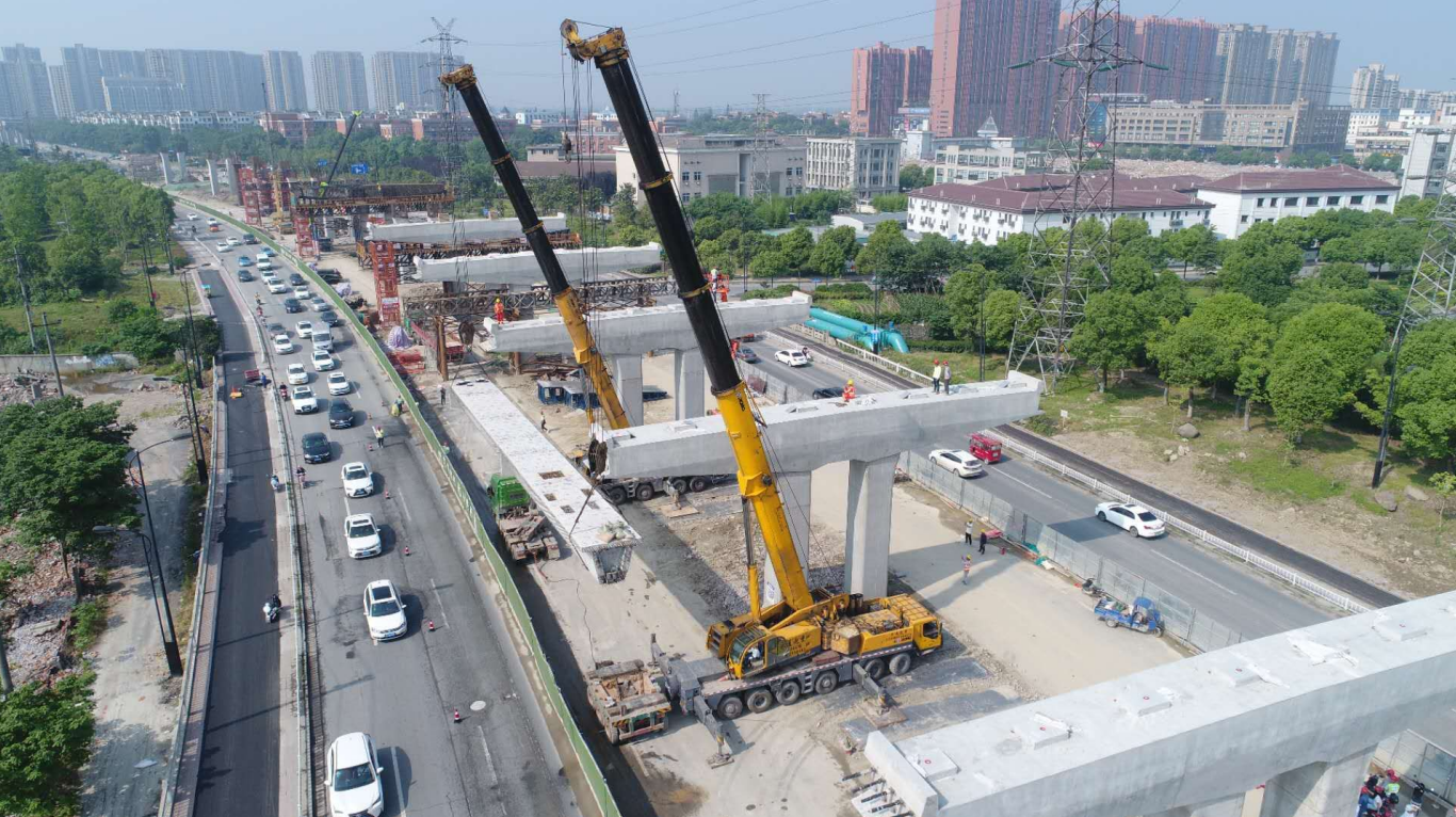 時代大道改建工程全長6595m,共有預制梁板1691片,首跨成功架設的預制梁板長25米,本次計劃連續架設梁板3跨,每跨8片,共計24片,計劃于6月7號左右完成本次24片梁板架設,并逐步開始連續架設。