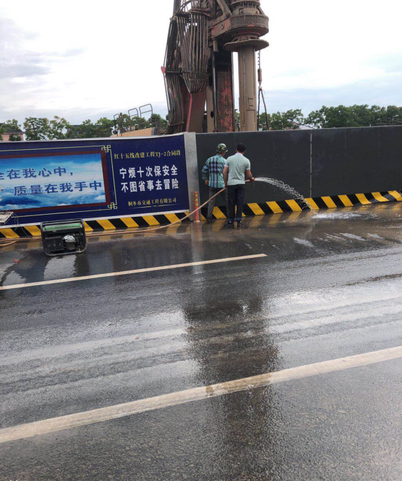 主要措施有:一是對施工現場主要道路,作業區路面進行硬化處理。二是對施工現場設置連續,封閉的綠籬圍擋,實行全封閉施工,安排6人專門對綠籬圍擋進行清洗和維護,特別是圍擋下泥土的清理,另安排8人對左右輔道的隔離帶進行清理清掃工作,保持施工整潔。三是建立灑水清掃制度,定時對周邊道路及施工便道灑水沖洗、渣土外運車輛進行沖洗,施工現場來不及外運的裸土鋪設防塵罩,保證施工現場不揚塵。四是安排專人進行全線巡查,發現路面破損進行及時的修補,保障交通順暢及行人安全。